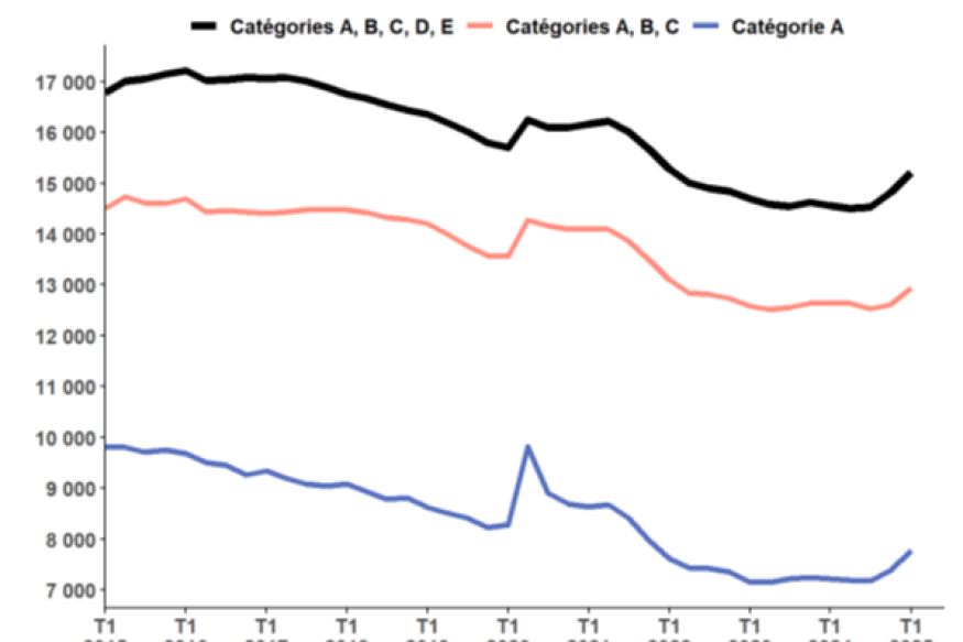 Selon le service statistique du ministère du Travail (Dares), au 1 trimestre 2025, le nombre de personnes inscrites à France Travail qui ne sont ni en attente d’orientation ni en parcours social (catégories A, B, C, D, E) croît de 2,7 % (+400) et augmente de 4,5 % sur un an. Le nombre de demandeurs d’emploi en catégories A, B, C croît de 2,6 % (+330) sur le trimestre et croît de 2,3 % sur un an. Le nombre de demandeurs d’emploi en catégorie A augmente de 5,3 % (+390) ce trimestre et croît de 7,8 % sur un an.