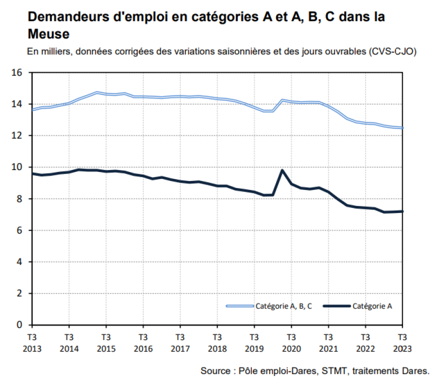 Selon les derniers chiffres de la direction régionale, de l'économie, de l'emploi, du travail et des solidarités, au troisième trimestre 2023, dans la Meuse, le nombre de demandeurs d’emploi tenus de rechercher un emploi et sans activité (catégorie A) s'établit en moyenne sur le trimestre à 7 200.