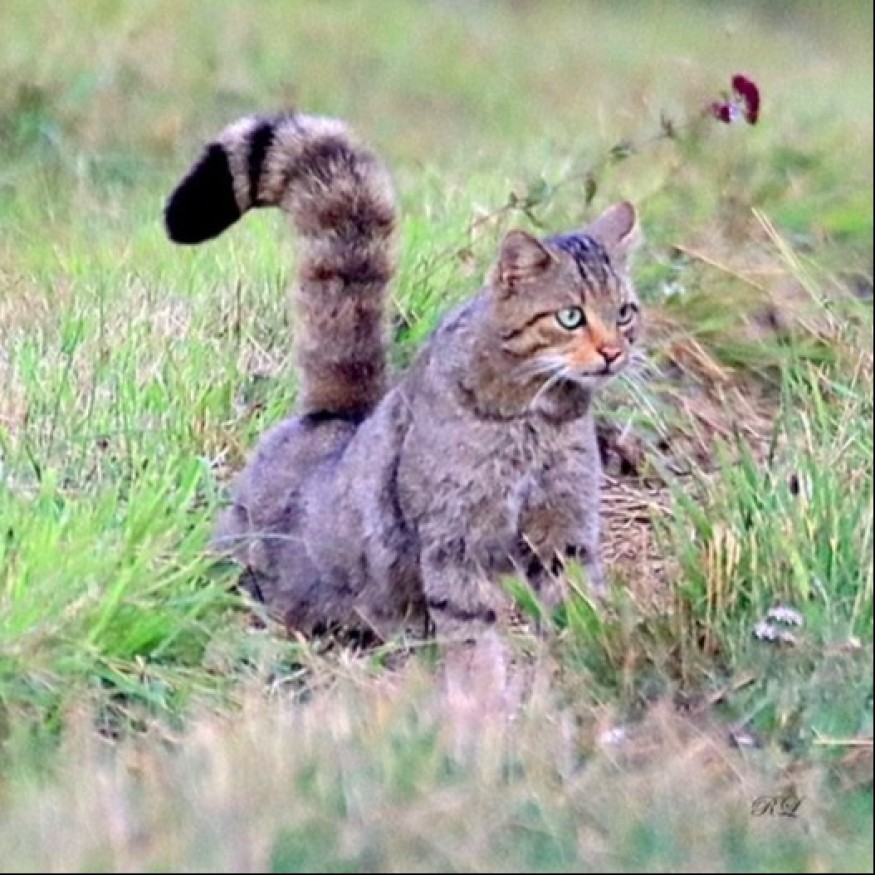Felis silvestris silvestris de son petit nom latin, le chat forestier est reconnaissable par son museau rose, ses yeux verts, une tache blanche sous le cou plus ou moins importante, une queue en forme de massue avec deux à quatre anneaux se finissant par un manchon noir et une ligne noire sur le dos s’arrêtant toujours à la base de la queue.