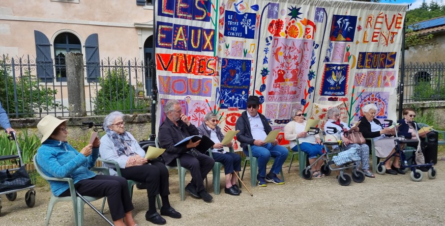 A l’occasion de l’inauguration des nouvelles œuvres 2024 de Vent des Forêts, les résidents des EHPAD « Les Eaux Vives » de Souilly, Pierrefitte-sur-Aire et Triaucourt, ont chantonné les musiques de leur enfance, accompagnés par l’accordéoniste Anthony MILLET et le chanteur Arnaud MARZORATI, devant un rideau de scène multicolore géant, qu'ils ont réalisé avec l’artiste plasticienne Alice JOUAN.