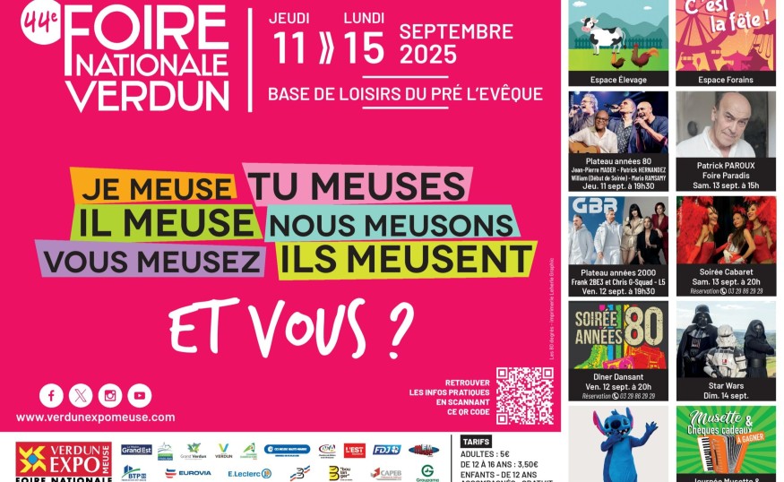Du 11 au 15 septembre, la base de loisirs du Pré l’Évêque accueillera la 44e édition de la Foire Nationale de Verdun. Un rendez-vous incontournable de la rentrée, organisé par l’association Verdun Expo Meuse, qui promet cette année encore une programmation riche et des espaces variés. À quelques jours de l’ouverture, Meuse FM, partenaire dépuis de nombreuses années, s’est entretenue avec monsieur Jean-Pierre Laparra, président de l’association organisatrice.