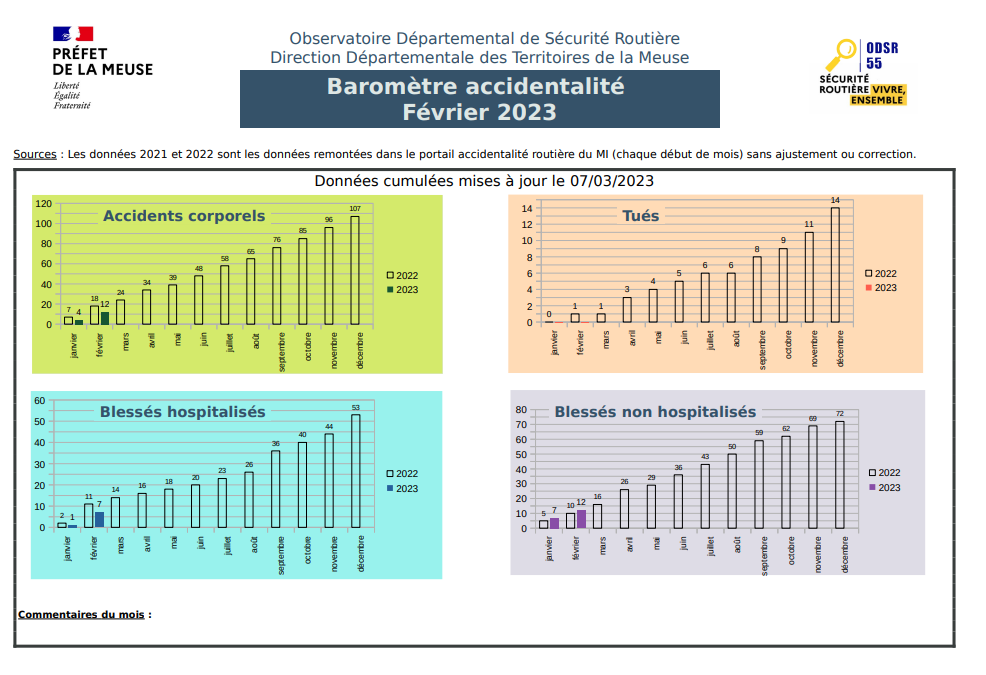 Sur le dernier bilan de la préfecture de la Meuse, on dénombre au 20 mars, un mort sur les routes du département en 2023, mais sur 5 ans, ce chiffre est élevé et représente un taux moyen des tuées (2017-2021) de 80 mots pour 1 million d'habitants, un taux au-dessus de la moyenne national (47).