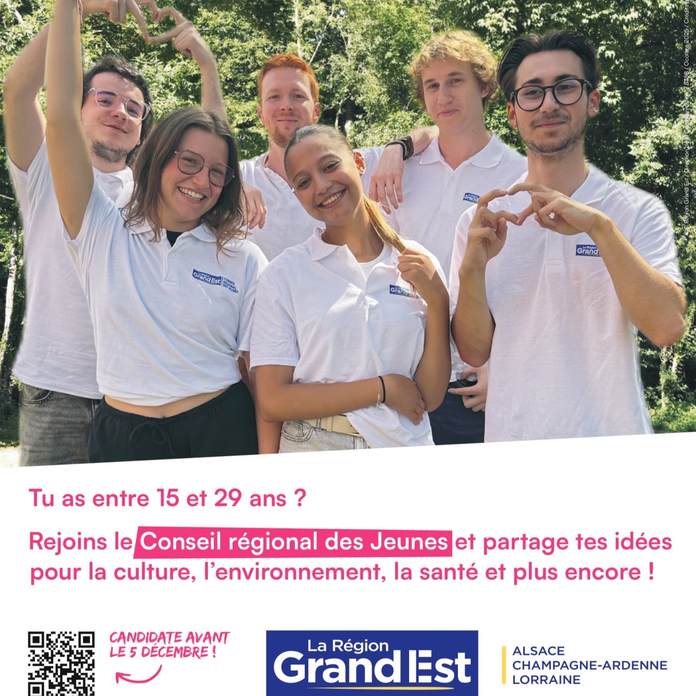 Si toi aussi tu veux t’engager, partager tes idées et devenir acteur du territoire du Grand Est, candidate avant le 5 décembre 2025, sur le site grandest.fr